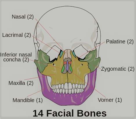 Facial Bones: The facial bones are also called as the viscerocranium, they support the soft tissues of the face and provides shape and characteristic features for the face. The facial bones are joined together with fibrous immovable Joints that attaches to the Skull, except the Mandible which is attached to the skull by a movable tempero-mandibular Joint that facilitates the movement of the lower Jaw for mastication and Speech. The facial skeleton provides protection for the brain and also serves as passage for Neuro vascular Structures. The facial bones are as follows.