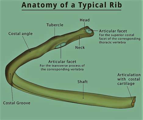 The typical ribs consist of head, neck and body or shaft. The Head is wedge shaped with two articular facets separated by a wedge of the bone. One facet articulates numerically corresponding to the thoracic vertebrae and other facet articulates with the above vertebrae. The neck simply connects the head with the body through a rough tubercle and articulates with the transverse process of the corresponding vertebrae. The Body or shaft of the rib is flat and curved. The internal surface of the shaft has a groove that provides neurovascular supply to the ribs and provides protection to the nerves and blood vessels.