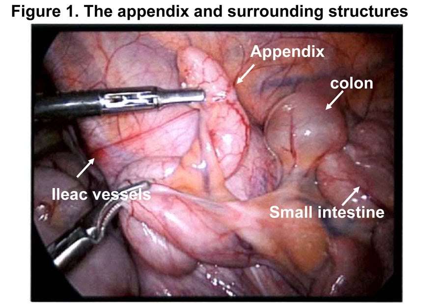 - Once the incision opens the abdomen cavity and the appendix is identified